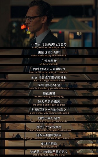 很久以来第一次这么沉浸式点看完了电影。电影采取倒叙方式,直到最后的第一幕,才明白第一幕是什么意思。第三幕的世界末日,各处的灾难,意味着查克的世界逐渐消亡,而他也走向死亡;第二幕讲述了查克的童年;第三幕讲述了查克再一次打开了阁楼看到的东西。(原来之前爷爷一直不让查克打开阁楼是有原因的),查克打开阁楼的门后,看见了他的死亡,但是不知道在什么时候。所以他爷爷说的那句话“等待是最煎熬的。”